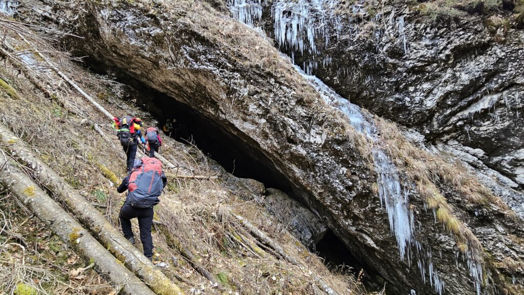 Due gli obiettivi principali: recuperare e reimpostare la strumentazione scientifica messa in grotta, e fare strada ai ragazzi del gruppo che non l’hanno mai vista. L’assenza di precipitazioni dell’ultimo mese non è garanzia della carenza di acqua in grotta, quindi siamo pronti a tornare indietro qualora non ci siano le condizioni di sicurezza. L’assenza di neve e la strada aperta ci permettono di lasciare l’auto in Grisol di dentro, al bivio per Rizzapol. Ramponcini ai piedi, affrontiamo l’ora di cammino alla grotta, scavalcando con un po’ di fatica gli sfasciumi di Vaia degli ultimi metri fuori sentiero e notando con costernazione che sul sentiero mancano i soliti 5-10 centimetri di neve. All’ingresso, pochissima acqua.